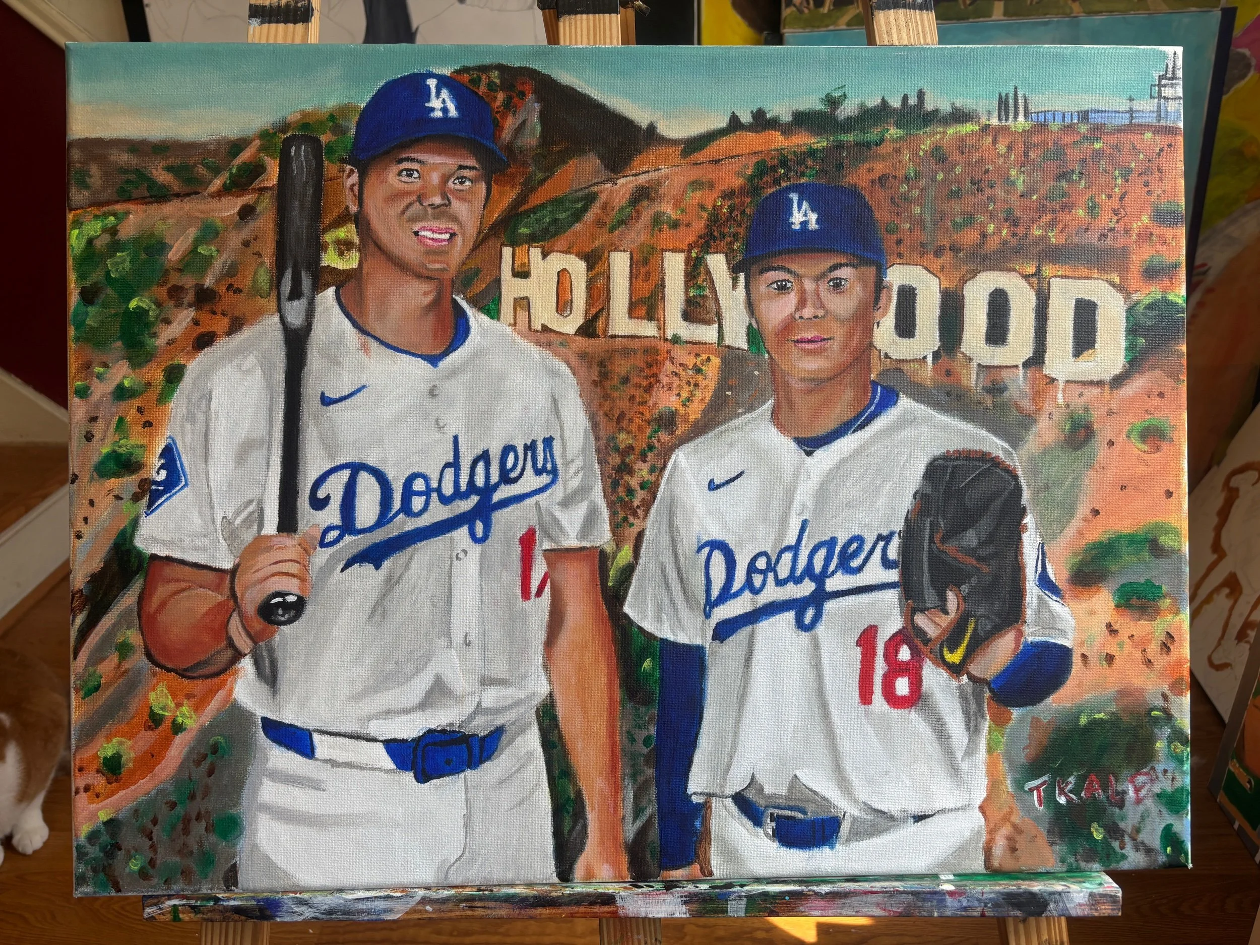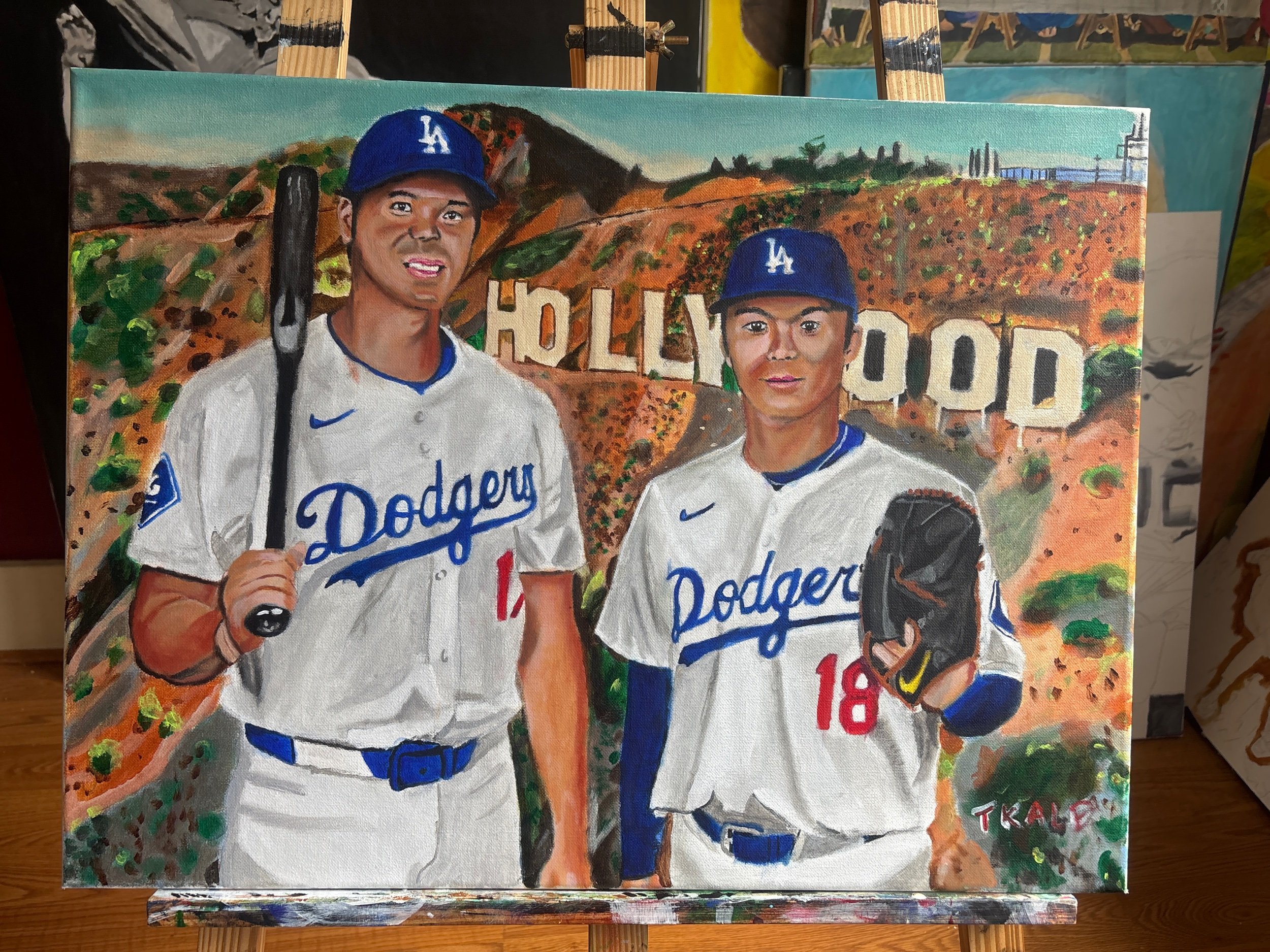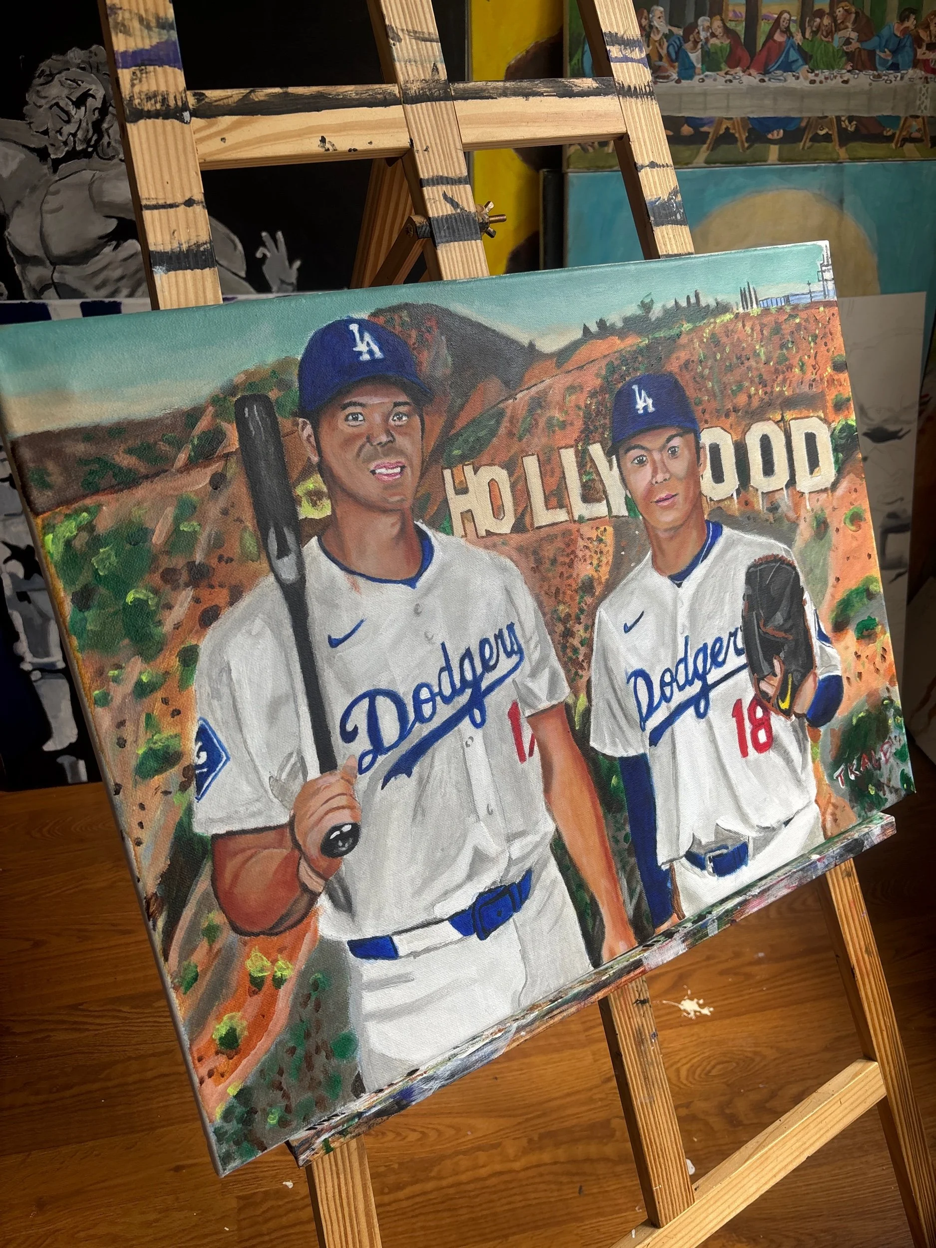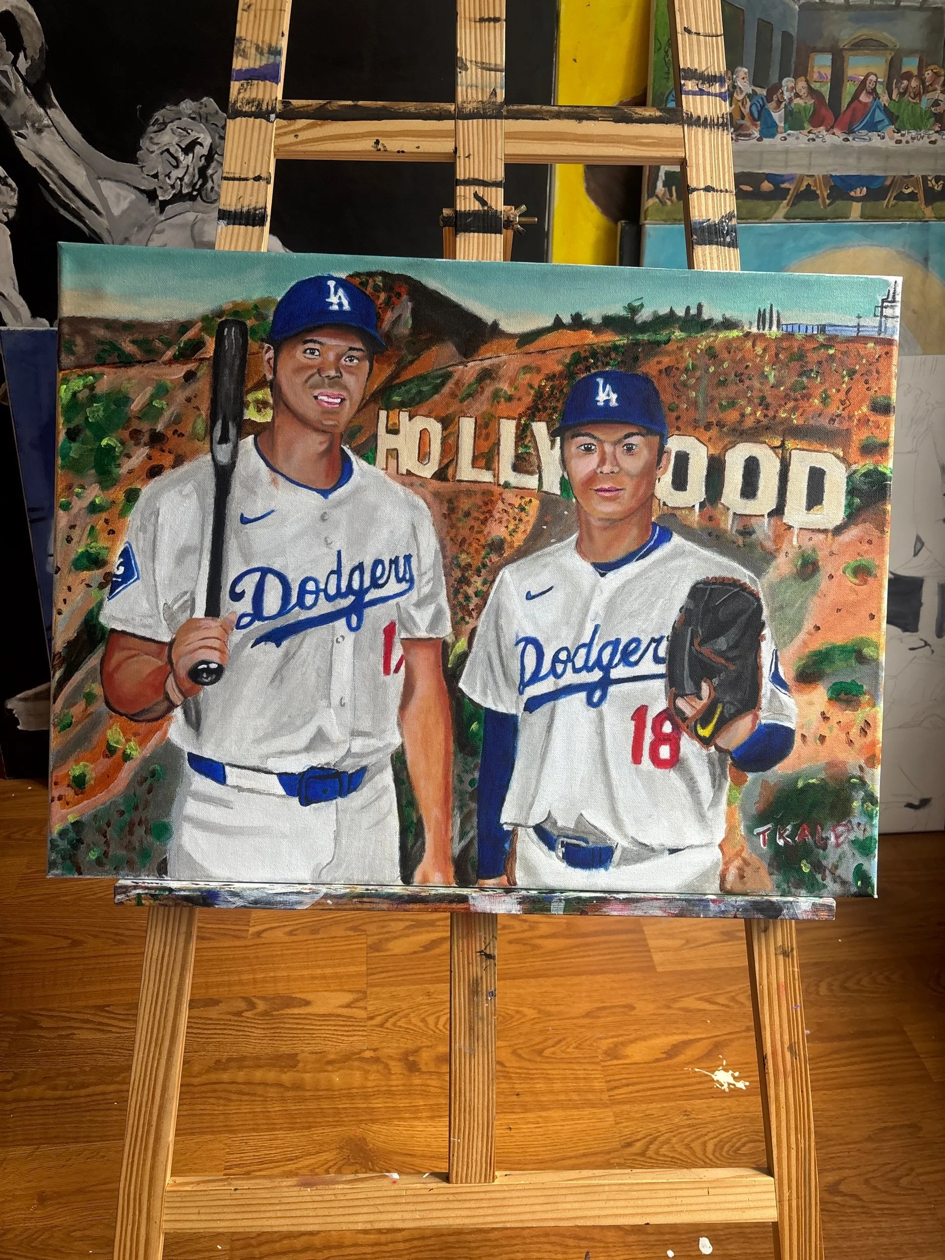 An 18x24 acrylic painting feature Los Angeles Dodgers players Shohei Ohtani and Yoshinobu Yamamoto. This is the original painting!
